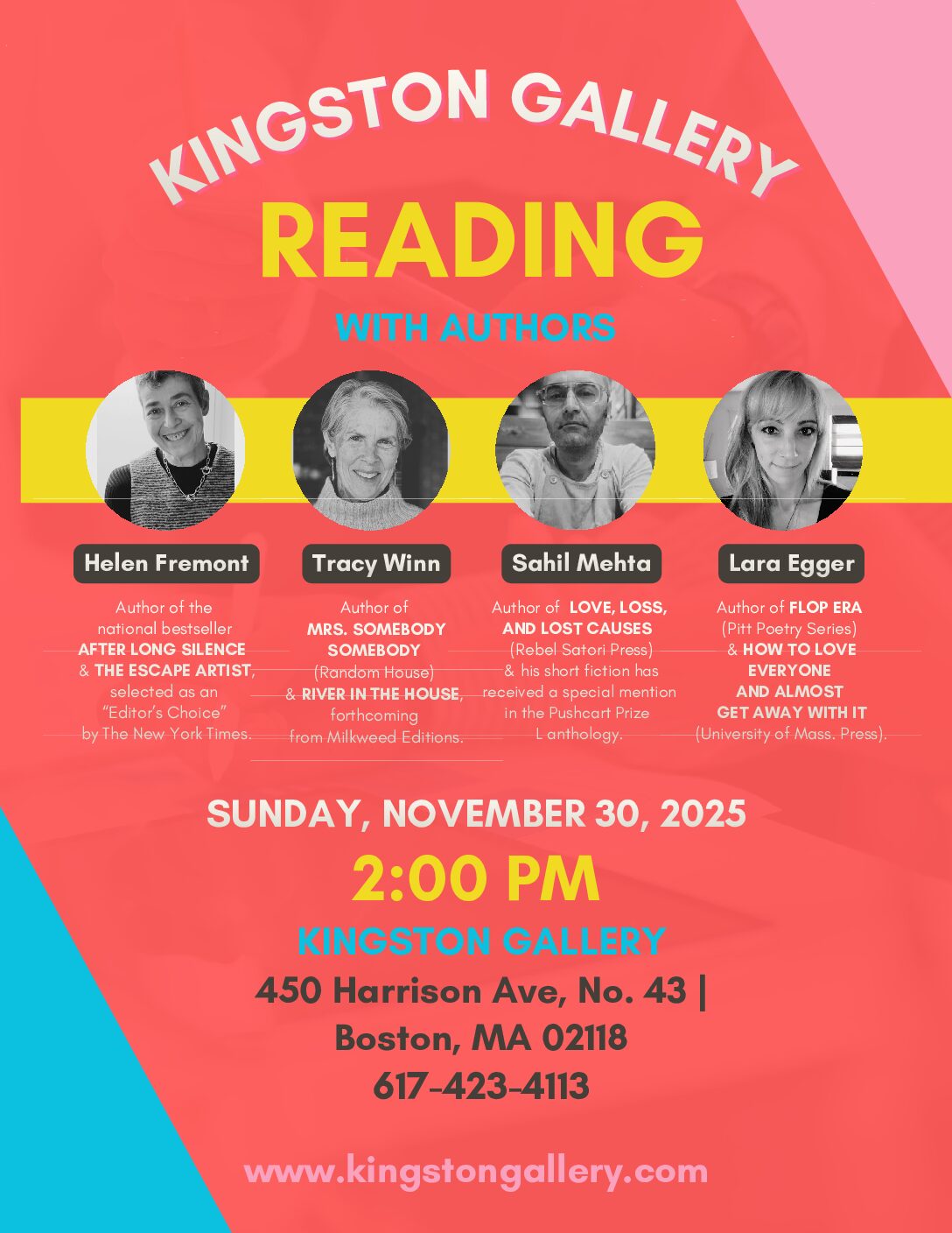 Join Helen, Tracy Winn, Lara Egger, and Sahil Mehta for a reading and reception at Kingston Gallery, Boston, MA at 2:00pm