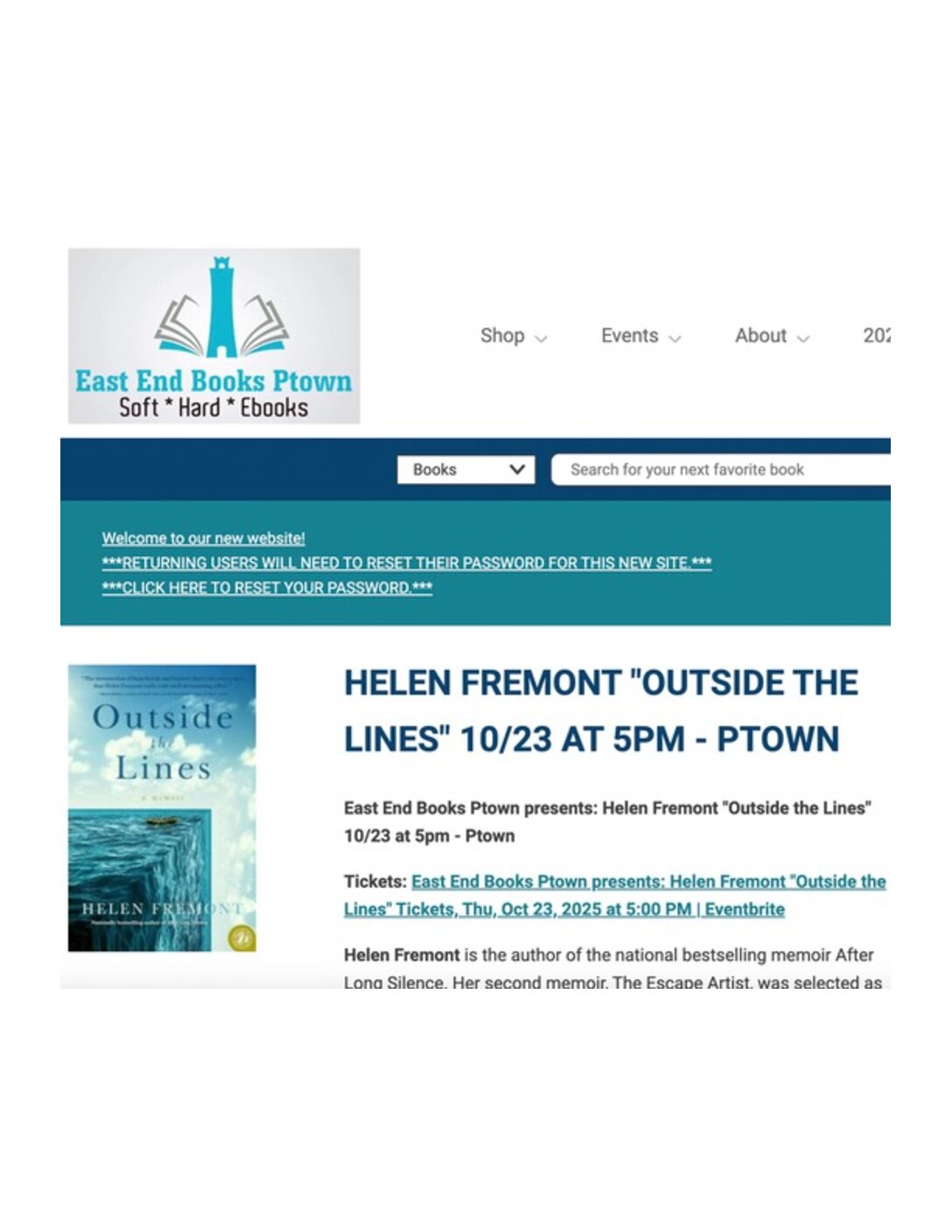 Join Helen at P-town’s East End Books at 5:00 pm for a talk about her new memoir, Outside the Lines. Home-baked goodies included!