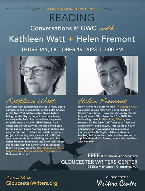 Join Helen in conversation with Kathleen Watt, author of the memoir "Rearranged" October 19, 2023, 7:00 pm Gloucester Writers Center 126
