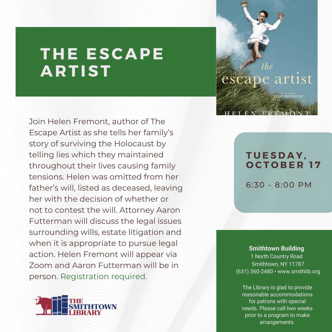 Join Helen Fremont, author of The Escape Artist, in conversation with Attorney Aaron Futterman at the Smithtown Library in Smithtown, NY. Helen will tell her family’s story of surviving the Holocaust, emigrating to America, and hiding their identity as Jews from colleagues, and friends, and their own children.