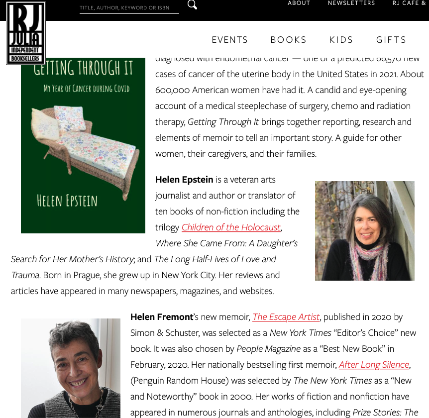 Join us for a Zoom conversation with Helen Fremont and Helen Epstein about Epstein’s new books, Getting Through It and Franci’s War.